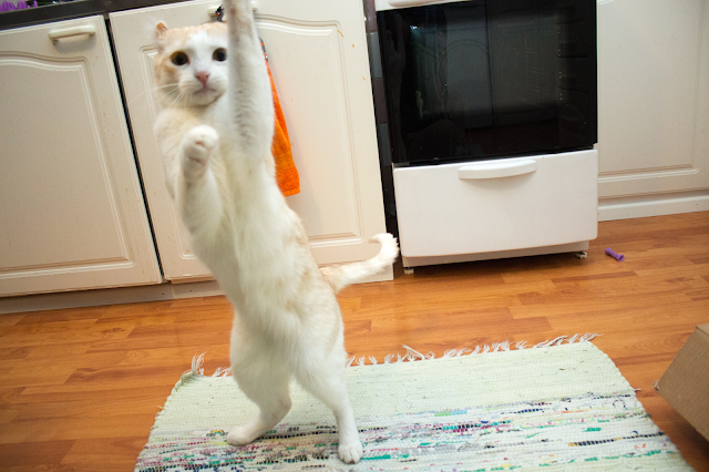 Synttäreitä ei juhlittu, osittain myös koska iso osa päivästä kului työjuttujen ympärillä ja niiden jälkeen olin ihan poikki. Poitsu oli tyytyväinen kun sai illalla juosta namien perässä, temppuilla ja leikkiä kanssani. Siinähän ne poitsun elämän tärkeimmät tulikin: leikki ja herkuttelu.